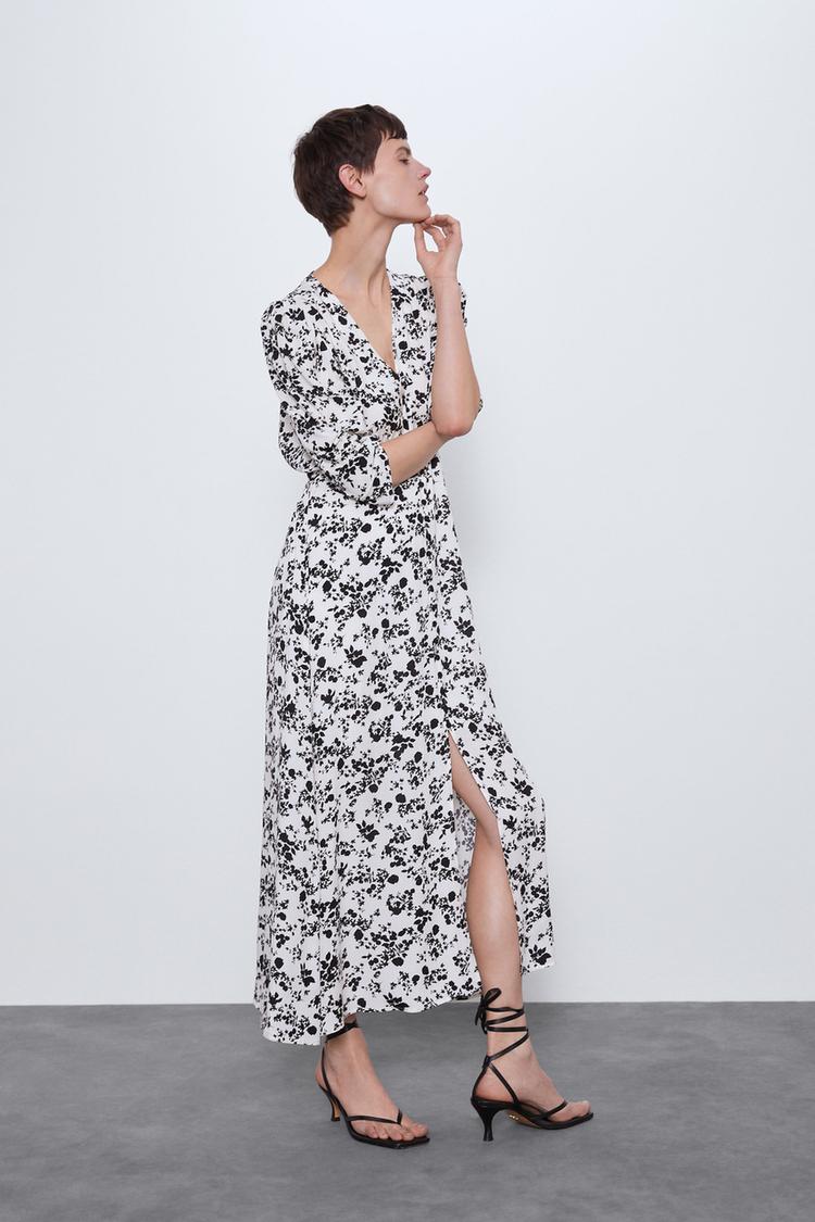 This dress is a perfect example of how summer trend can easily become autumnal trend. You can see the flower pattern on this dress but you can also see that it has more kind of a autumnal dark colors and we see it as a perfect item to pair with chunky boots and black leather jacket.