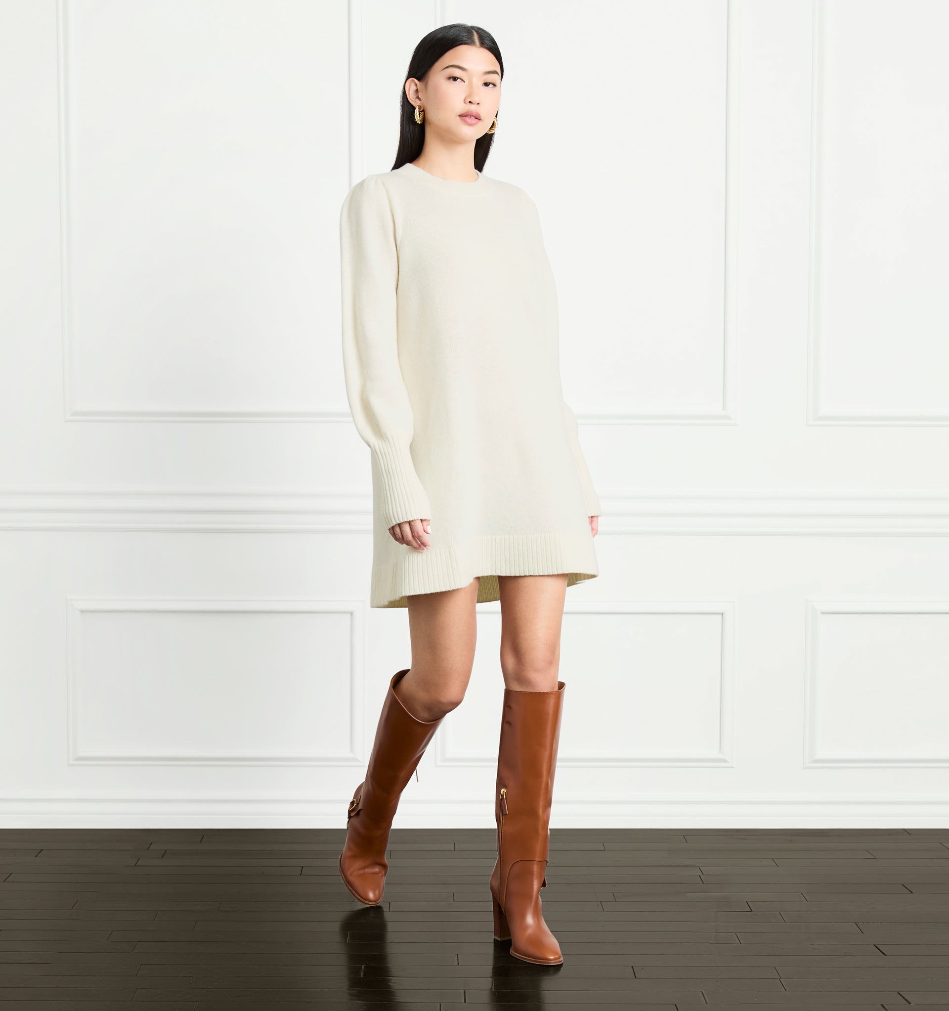 A chic and classic way to style a sweater dress is to go for monochromatic layering. It will definitely turn heads. Choose a neutral shade when deciding your one-in-done color for the sweater dress as it is less likely to risk being overwhelming to the eyes. A more neutral shade, such as cream will be able to add dimension to your outfit like this Sylvie Sweater dress. Made from mid-weight, extra-fine merino wool, it falls to a mid-thigh. And is perfect for wearing with flats or pairing with tights and boots on chillier days.