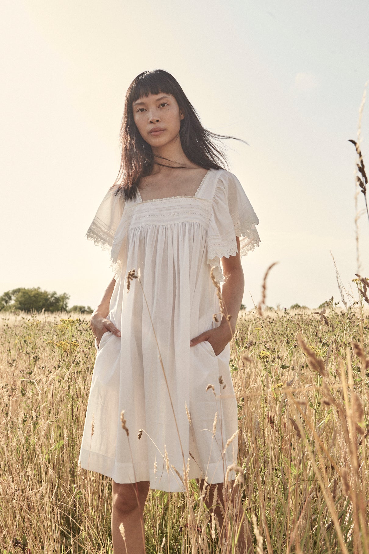Fall in love with the Pansy dress and experience the perfect romantic look! The graceful, ruffled ‘angel’ effect sleeve will already have you enchanted. Crafted out of luxurious cotton voile and edged with delicate cotton broderie trims, this style will make waves in any wardrobe. Whether you show it off as a night dress or adorn your daytime outfit, you’ll be sure to find that special something that will elevate your style. Make this gorgeous number shine even more by pairing it with strappy sandals and standout earrings – we guarantee that all eyes will be on you!